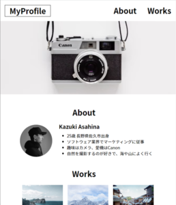 練習で作成したポートフォリオサイトです。レスポンシブ対応になっています。(Visual Studio Codeで作成、このサイトに移動するにはここをクリック)